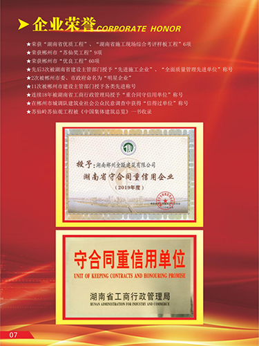 公司注冊資本金6000萬元,現(xiàn)有各類專業(yè)技術管理人員135人,其中具有高級工程師(經(jīng)濟師) 3人,中級職稱工程師、會計師31人,一級建造師7人,貳級建造師16人,取得建筑工程崗位證的施工員、安全員,質量員等人員89人。近年來,公司認真貫徹落實國家有關建設工程法律法規(guī),積極推行質量安全標準化管理,狠抓工程質量安全管理,秉承“對業(yè)主負責,讓用戶放心”的經(jīng)營理念,堅持“一流的建筑質量、一流的施工安全、一流的生產(chǎn)效率”的公司宗旨,優(yōu)良率80%以上。先后榮獲省、市級“優(yōu)質工程”、“施工現(xiàn)場綜合考評樣板工程”65項,郴州市“蘇仙獎工程”9項,“湖南省優(yōu)質工程”4項。公司先后16次被省、市建設主管部門授予“先進施工企業(yè)”稱號,2次被郴州市委、市政府命名為“明星企業(yè)”,連續(xù)9年被省工商行政管理部門授予省級“重合同守信用單位”稱號,被市金融部門評定為“AA級信用等級單位”。在郴州市城調隊建筑業(yè)社會公眾民意調查中獲“信得過單位”稱號。公司信譽和工程質量得到了社會各界的廣泛認同和肯定。